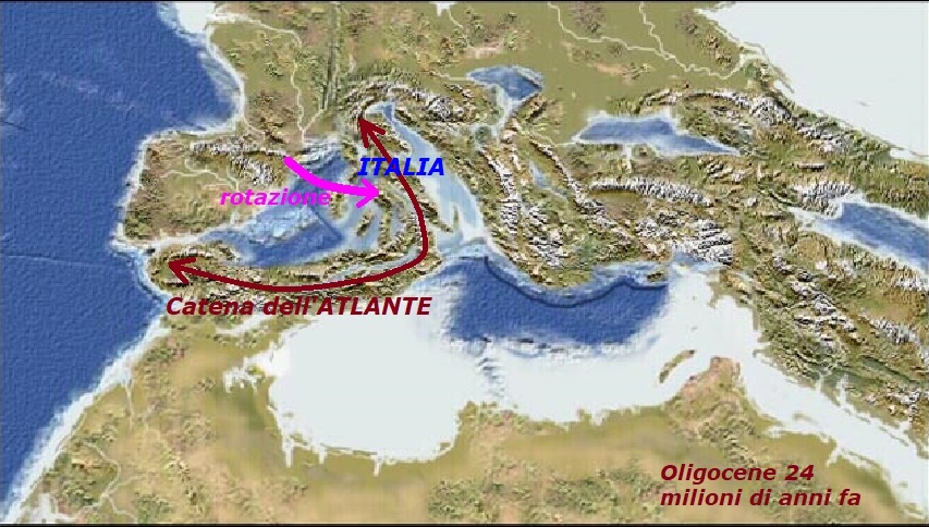 Nel periodo Oligocene circa 24 Milioni di anni fa, la Corsica e la Provenza, facendo perno sul golfo di Genova, ruotano in senso antiorario e si distaccano dall’ Europa – Questa fenomeno provoca uno sprofondamento dei territori a ovest del blocco Sardo Corso con la conseguente formazione del Bacino Balearico e del Mar Ligure – Questa rotazione comprime e accumula i materiali verso EST, si ha un’altra nuova OROGENESI, quella Appenninica, ovvero la nascita degli APPENNINI