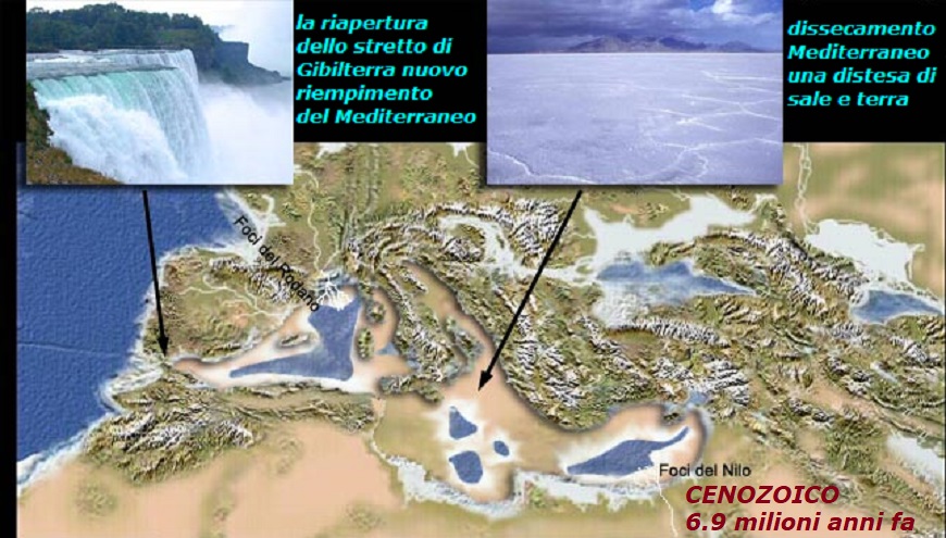 Circa 6,9 milioni di anni fa nel Cenozoico, ancora il continuo avvicinamento della Placca Africana verso l’Europa, ancora in atto Oggi, produsse la chiusura dello stretto di Gibilterra – Altre cause vanno ricercate nell’abbassamento del livello marino del Mediterraneo, possibile anche una imponente Centenaria Glaciazione, il Mediterraneo divenne un mare completamente chiuso.